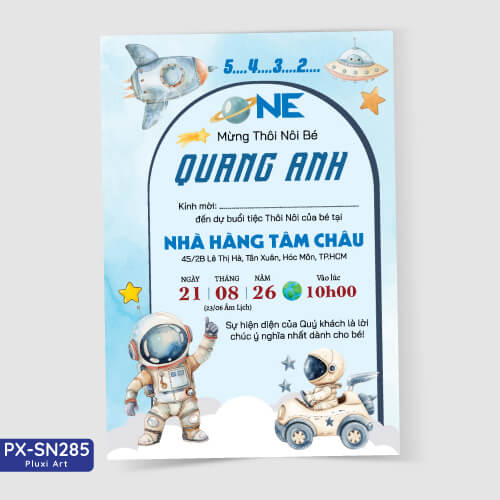 Một tấm Thiệp Thôi Nôi bé trai Du hành vũ trụ độc đáo, ngộ nghĩnh và đáng yêu không chỉ tạo được ấn tượng cho người nhận mà còn thể hiện sự chu đáo của người tổ chức. Hãy cùng với Pluxi tạo nên những cánh thiệp thôi nôi thật xinh và thể hiện cá tính của bé. Thiệp Thôi Nôi bé trai Du hành vũ trụ cho bé trai cute, tinh tế .Pluxi sẽ mang đến ngày càng nhiều mẫu thiệp để đáp ứng yêu cầu và sở thích của các bậc cha mẹ và các bé .